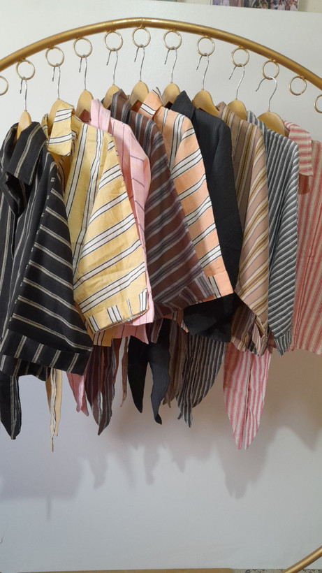 شومیزگره ای خط دار،آستین سه ربع،یقه دار،جلودکمه